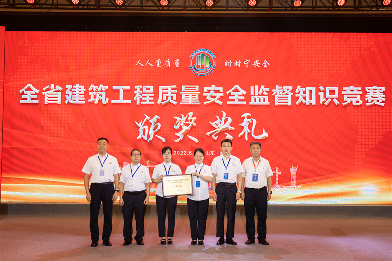 6月30日,山東省建筑工程質(zhì)量安全監(jiān)督知識(shí)競賽爭冠賽在濰坊舉行,集團(tuán)公司副總裁周兵一帶隊(duì)參加,經(jīng)過“搶灘登陸”、“勇往直前”、“火眼金睛”等環(huán)節(jié)的激烈比拼,集團(tuán)公司質(zhì)量團(tuán)隊(duì)、安全團(tuán)隊(duì)脫穎而出,分別獲得爭冠賽團(tuán)隊(duì)一等獎(jiǎng)。