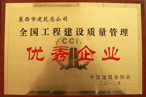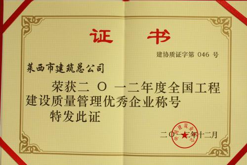 我公司榮獲2012年度全國(guó)工程建設(shè)質(zhì)量管理優(yōu)秀企業(yè)
