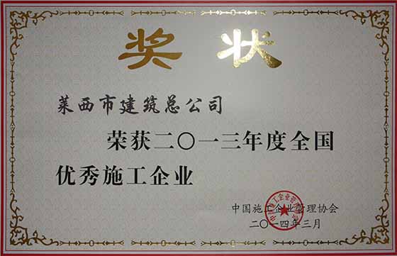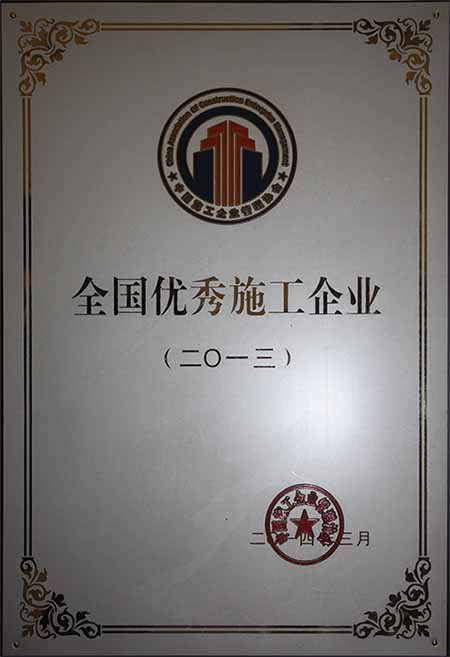 2014年4月17日至19日,中國(guó)施工企業(yè)管理協(xié)會(huì)在江蘇南京召開第29次年會(huì),會(huì)上通報(bào)表彰了榮獲2013年度“全國(guó)優(yōu)秀施工企業(yè)”、“全國(guó)工程建設(shè)優(yōu)秀項(xiàng)目經(jīng)理”的先進(jìn)單位和個(gè)人,我公司再次再次獲得“全國(guó)優(yōu)秀施工企業(yè)”榮譽(yù)稱號(hào),一公司董建明總經(jīng)理被評(píng)為“全國(guó)工程建設(shè)優(yōu)秀項(xiàng)目經(jīng)理”。
