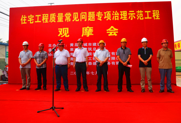 7月1日,住宅工程質(zhì)量常見問題專項治理示范工程觀摩會在我公司李明項目部施工的云龍港灣工程召開。青島市建筑工程管理局總工程師孫憲閣、青島市質(zhì)監(jiān)站總工程師崔浩,黃島區(qū)建設(shè)局副局長薛旻傳、區(qū)建管辦主任張偉等有關(guān)領(lǐng)導(dǎo)到會,公司董事長孫涌出席會議,副總經(jīng)理于振方在會議上作了介紹發(fā)言,開發(fā)、監(jiān)理、施工單位1000余人參加了觀摩會。