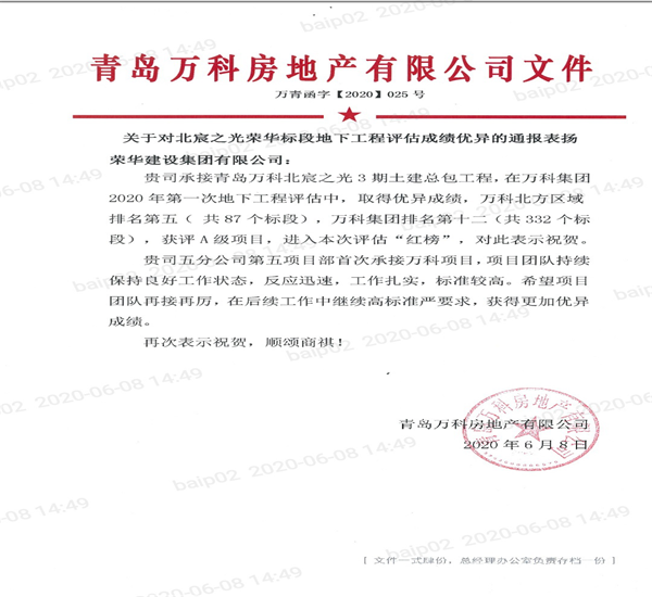 五公司第五項(xiàng)目部在于鵬經(jīng)理帶領(lǐng)下,發(fā)揚(yáng)榮華集團(tuán)敢打硬仗、爭(zhēng)創(chuàng)一流的拼搏精神,順利完成該項(xiàng)目。在萬(wàn)科集團(tuán)2020年第一次地下工程評(píng)估中,該項(xiàng)目獲評(píng)A級(jí)項(xiàng)目,取得了優(yōu)異成績(jī),為公司贏得了榮譽(yù)。