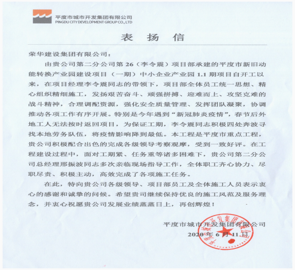 近日,集團公司總部收到平度市城市開發(fā)集團有限公司發(fā)來的表揚信,對二公司李令震項目部施工的平度市新舊動能轉(zhuǎn)換產(chǎn)業(yè)園建設(shè)項目(一期)中小企業(yè)產(chǎn)業(yè)園1.1期項目提出表揚。