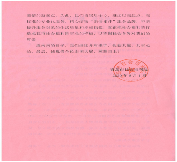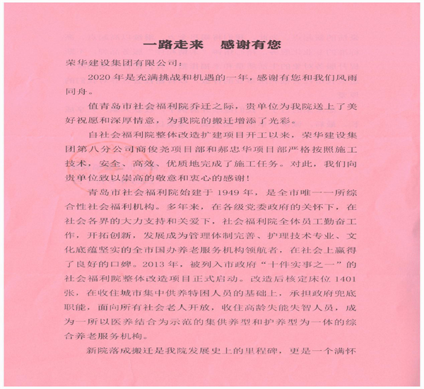 近日,集團(tuán)總部收到青島市社會(huì)福利院發(fā)來(lái)的表?yè)P(yáng)信,對(duì)八公司商俊堯和郝中華項(xiàng)目部改造擴(kuò)建青島市社會(huì)福利院項(xiàng)目提出表?yè)P(yáng)。
