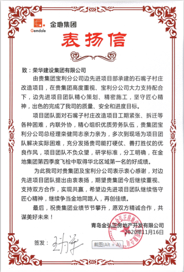 近日,集團(tuán)總部收到青島金弘正房地產(chǎn)開發(fā)有限公司發(fā)來的表揚(yáng)信,對寶利公司邊先進(jìn)項(xiàng)目部承建的石嘴子村莊改造項(xiàng)目提出表揚(yáng)。