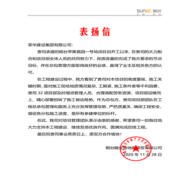 近日,集團(tuán)總部收到煙臺(tái)融安房地產(chǎn)有限公司發(fā)來的表揚(yáng)信,對(duì)七公司第三十二仲濤項(xiàng)目部承建的煙臺(tái)蘋果嘉園一號(hào)地項(xiàng)目提出表揚(yáng)。
