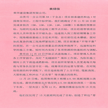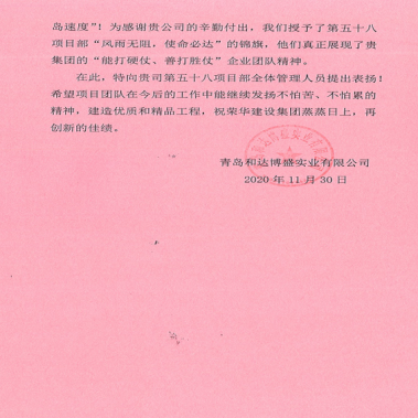 近期,集團公司總部收到青島和達博盛實業(yè)有限公司發(fā)來的表揚信,對一公司第五十八(于全志)項目部施工的和達可園商住項目提出表揚。