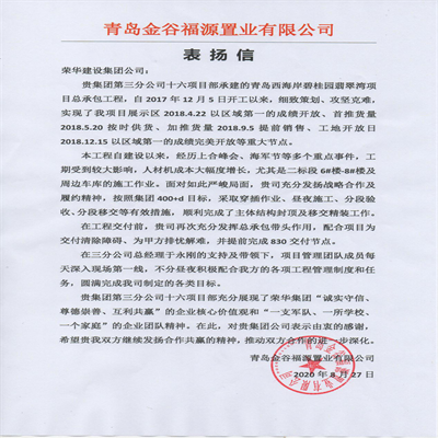 近日,集團(tuán)總部收到青島金谷福源置業(yè)有限公司發(fā)來的表?yè)P(yáng)信,對(duì)三公司十六(王慎平)項(xiàng)目部施工的青島西海岸碧桂園翡翠灣項(xiàng)目總承包工程提出表?yè)P(yáng)。