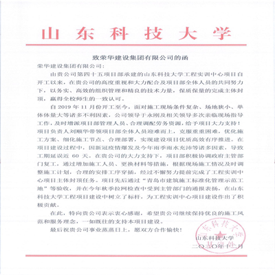 近日,集團(tuán)總部收到山東科技大學(xué)發(fā)來的表揚(yáng)信,對三公司四十五(劉順華)項(xiàng)目部施工的山東科技大學(xué)工程實(shí)訓(xùn)中心項(xiàng)目提出表揚(yáng)。