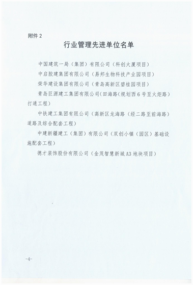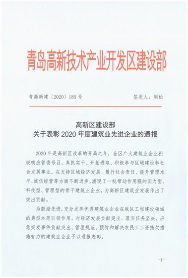 近期,青島高新區(qū)建設(shè)部發(fā)布《關(guān)于關(guān)于表彰2020年度建筑業(yè)先進(jìn)企業(yè)的通報(bào)》,三公司第十六(王慎平)項(xiàng)目部施工的青島高新區(qū)碧桂園項(xiàng)目綜合管理水平優(yōu)異,為集團(tuán)公司贏得“行業(yè)管理先進(jìn)單位”稱號,并對集團(tuán)公司在重大活動(dòng)、應(yīng)急保障、清欠維穩(wěn)方面做出的突出貢獻(xiàn)進(jìn)行表彰。