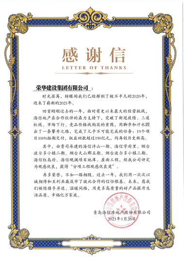 近日,集團公司收到青島海信房地產(chǎn)股份有限公司發(fā)來的感謝信,對過去一年與集團公司的通力合作表示衷心的感謝。