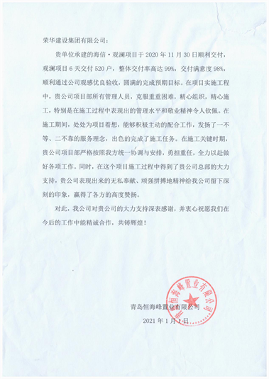 近期,集團(tuán)總部收到青島和恒海峰置業(yè)有限公司發(fā)來的表揚(yáng)信,對四公司第三十四(朱勇)項(xiàng)目部施工的海信觀瀾項(xiàng)目提出表揚(yáng)。