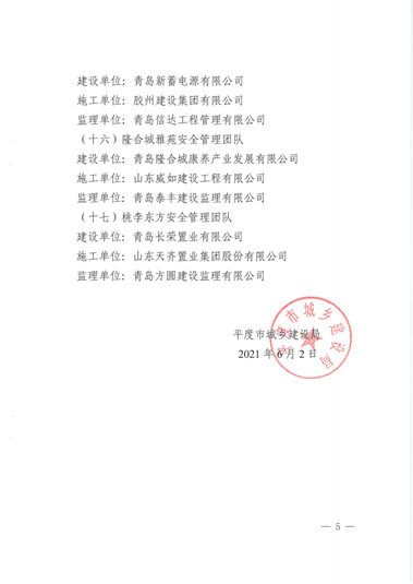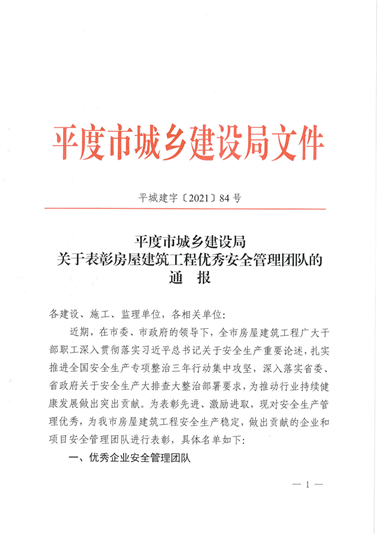 集團總部受到平度市城鄉(xiāng)建設局關(guān)于表彰房屋建筑工程優(yōu)秀安全管理團隊的通報