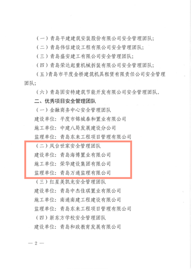 近日,平度市城鄉(xiāng)建設局發(fā)布了關(guān)于表彰房屋建筑工程優(yōu)秀安全管理團隊的通報,其中四公司第四十一孫承學項目部施工的平度市海信九賢府項目和二公司第十五李一項目部施工的海信鳳臺世家項目被評為優(yōu)秀項目安全管理團隊,為集團公司贏得了榮譽。 希望項目部繼續(xù)精益求精,堅持不懈,發(fā)揚不怕苦、不怕累的工作精神,用更多高質(zhì)量的好產(chǎn)品提升生活品質(zhì)、幸福億萬家庭!