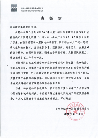 近期,集團總部收到平度市城市開發(fā)集團有限公司發(fā)來的表揚信,對李令震項目部施工的平度市新舊動能轉(zhuǎn)換產(chǎn)業(yè)園建設(shè)項目(一期)中小企業(yè)產(chǎn)業(yè)園1.2、1.3期項目提出表揚。