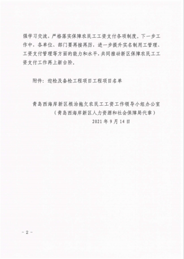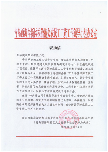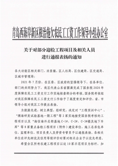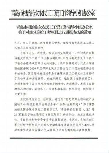 近期,集團(tuán)公司總部收到來自青島市、西海岸新區(qū)兩級(jí)根治拖欠農(nóng)民工工資工作領(lǐng)導(dǎo)小組辦公室發(fā)來的通報(bào)表揚(yáng)。對(duì)集團(tuán)公司承建的山東科技大學(xué)工程實(shí)訓(xùn)中心項(xiàng)目、海信海外總部基地項(xiàng)目、中德未來城一期住宅建設(shè)項(xiàng)目、黃島街道島外九個(gè)社區(qū)搬遷改造工程、平度市新舊動(dòng)能轉(zhuǎn)換產(chǎn)業(yè)園建設(shè)項(xiàng)目(一期)中小企業(yè)產(chǎn)業(yè)園1.1-1.3期項(xiàng)目、海信.鳳臺(tái)世家、青島萊西市人才公寓建設(shè)項(xiàng)目、東城時(shí)代項(xiàng)目等8個(gè)工程提出表揚(yáng)。