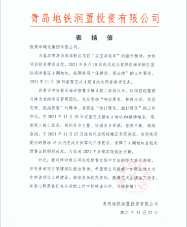 近日,集團公司收到青島地鐵潤置投資有限公司發(fā)來的表揚信,對開發(fā)區(qū)公司郭月峰項目部施工的西海岸新區(qū)國際海洋智區(qū)4期地塊項目提出表揚。