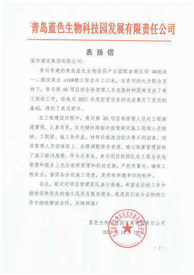近日,集團(tuán)公司收到藍(lán)色生物科技園發(fā)展有限責(zé)任公司發(fā)來的表揚(yáng)信,對八公司郝忠華項(xiàng)目部施工的青島藍(lán)色生物醫(yī)藥產(chǎn)業(yè)園配套商住項(xiàng)目4#地塊一、二期及商業(yè)s10#樓工程提出表揚(yáng)。