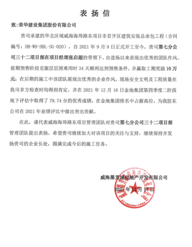 近日,集團(tuán)公司收到威海墨芳城房地產(chǎn)開發(fā)有限公司發(fā)來的表揚(yáng)信,對(duì)七公司張啟超項(xiàng)目部施工的金地威海海埠路東項(xiàng)目非首開區(qū)建筑安裝總承包工程提出表揚(yáng)。