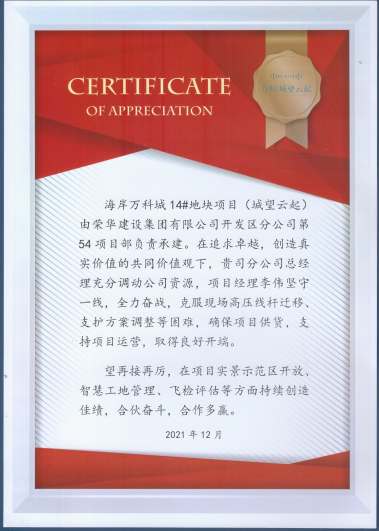 近日,集團(tuán)公司收到萬科城望云起項目部發(fā)來的表揚信,對開發(fā)區(qū)公司李偉項目部施工的海岸萬科城14#地塊項目提出表揚。