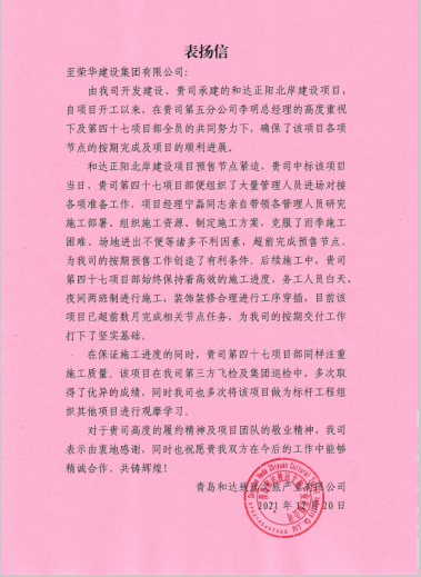 近日,集團(tuán)公司收到青島和達(dá)致遠(yuǎn)文旅產(chǎn)業(yè)有限公司發(fā)來的表揚(yáng)信,對五公司第四十七項目部施工的和達(dá)正陽北岸建設(shè)項目提出表揚(yáng)。