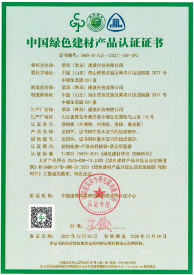 2021年12月30日,榮華(青島)建設(shè)科技有限公司順利通過山東省首批裝配式混凝土結(jié)構(gòu)預(yù)制構(gòu)件(預(yù)制墻板、預(yù)制樓板、預(yù)制樓梯)“綠色建材三星級(jí)認(rèn)證”。