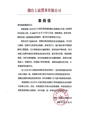 近日,集團(tuán)公司收到煙臺上宸置業(yè)有限公司發(fā)來的表揚(yáng)信,對三公司第十六(王慎平)項(xiàng)目部施工的龍湖春江天璽小區(qū)二標(biāo)段項(xiàng)目提出表揚(yáng)。