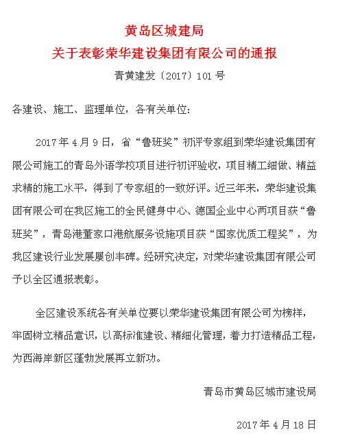 4月9日,山東省建筑業(yè)協(xié)會(huì)魯班獎(jiǎng)?lì)A(yù)檢專(zhuān)家組到寶利公司孫有建、顏坤項(xiàng)目部施工的青島外語(yǔ)學(xué)校新建工程一期項(xiàng)目進(jìn)行魯班獎(jiǎng)初評(píng)。通過(guò)對(duì)工程的實(shí)體質(zhì)量和工程技術(shù)資料檢查,專(zhuān)家組對(duì)該項(xiàng)目的前期工作給予了高度評(píng)價(jià)和充分肯定。近三年,集團(tuán)公司連續(xù)在黃島區(qū)施工的全民健身中心、德國(guó)企業(yè)中心兩個(gè)項(xiàng)目榮獲魯班獎(jiǎng),青島港董家口港航運(yùn)服務(wù)設(shè)施項(xiàng)目獲得“國(guó)家優(yōu)質(zhì)工程獎(jiǎng)”,為黃島區(qū)建設(shè)行業(yè)發(fā)展樹(shù)立了標(biāo)桿,受到了黃島區(qū)城市建設(shè)局的通報(bào)表?yè)P(yáng)。