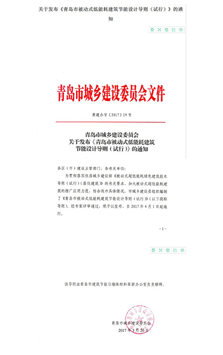 由我集團(tuán)公司參與編制的全國首個被動房地方標(biāo)準(zhǔn)《青島市被動房低能耗建筑節(jié)能設(shè)計(jì)導(dǎo)則》正式頒布實(shí)施。