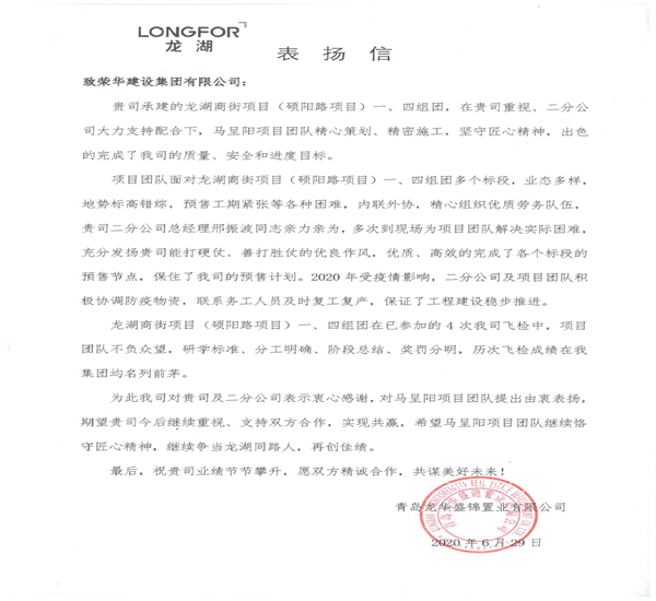 2020年6月29日,青島龍華盛錦置業(yè)公司發(fā)來表揚信,對二公司馬呈陽項目部承建龍湖商街項目(碩陽路項目)提出了表揚。
