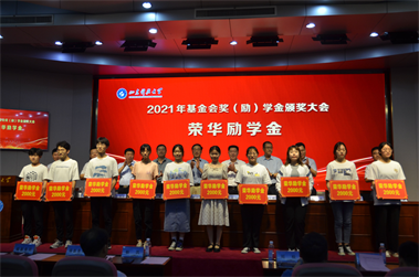 合作發(fā)展處處長、基金會副理事長、秘書長王曉東宣讀了《關(guān)于表彰2021年度“榮華獎學(xué)金”獲獎學(xué)生的決定》,與會領(lǐng)導(dǎo)為獲獎學(xué)生頒獎并合影留念。獲獎學(xué)生代表表達(dá)了對榮華建設(shè)集團(tuán)和學(xué)校的感激之情,表示會再接再厲,再創(chuàng)佳績。