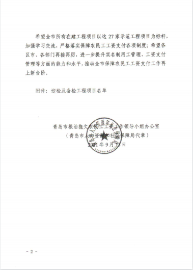 近期,集團(tuán)公司總部收到來自青島市、西海岸新區(qū)兩級(jí)根治拖欠農(nóng)民工工資工作領(lǐng)導(dǎo)小組辦公室發(fā)來的通報(bào)表揚(yáng)。對(duì)集團(tuán)公司承建的山東科技大學(xué)工程實(shí)訓(xùn)中心項(xiàng)目、海信海外總部基地項(xiàng)目、中德未來城一期住宅建設(shè)項(xiàng)目、黃島街道島外九個(gè)社區(qū)搬遷改造工程、平度市新舊動(dòng)能轉(zhuǎn)換產(chǎn)業(yè)園建設(shè)項(xiàng)目(一期)中小企業(yè)產(chǎn)業(yè)園1.1-1.3期項(xiàng)目、海信.鳳臺(tái)世家、青島萊西市人才公寓建設(shè)項(xiàng)目、東城時(shí)代項(xiàng)目等8個(gè)工程提出表揚(yáng)。