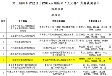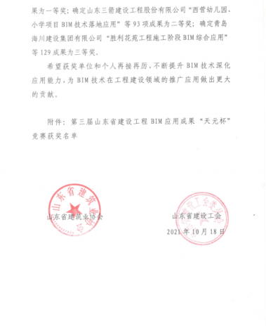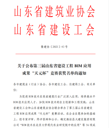 10月25日,山東省建筑業(yè)協(xié)會發(fā)文“公布第三屆山東省建設(shè)工程BIM應(yīng)用成果‘天元杯’競賽獲獎名單”,集團公司榮獲五個獎項。