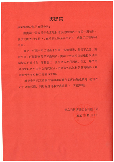 近日,集團(tuán)公司收到青島和達(dá)博盛實業(yè)有限公司發(fā)來的表揚信,對一公司第五十八項目部施工的和達(dá)·可園項目提出表揚。